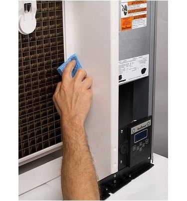 Close-up of a technician carefully cleaning an ice machine interior.